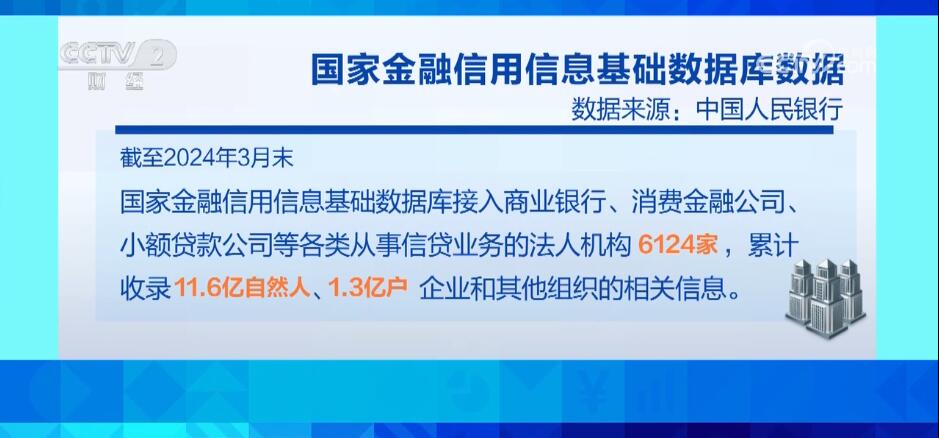 截至2024年3月末,国家金融信用信息基础数据库接入商业银行、消费金融公司、公司等各类从事信贷业务的法人机构6124家,累计收录11.6亿自然人、1.3亿户企业和其他组织的相关信息。